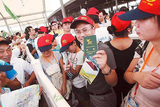 8月29日,一名农民工在世博园展示自己的世博护照。