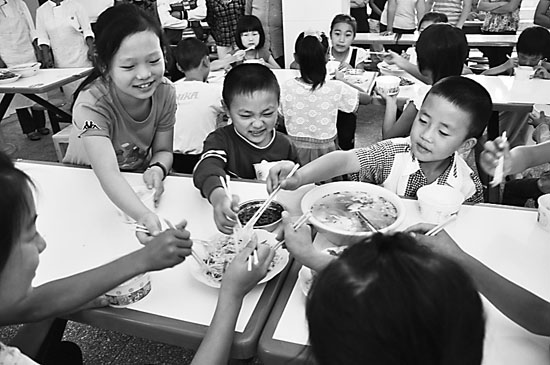 8月30日,重庆云阳县清水土家族乡民族小学的学生在餐厅用餐。当日是重庆云阳县清水土家族乡民族小学新学年报名的日子。从新学年的第一天起,该县所有海拔千米以上学校的7000余名农村学生将享受由政府提供的免费午餐。云阳目前已建成“爱心食堂”46个,专用保管室32个,餐厅21个。