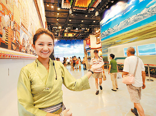 8月31日,上海世博会西藏馆的礼仪小姐德央引导游客参观。