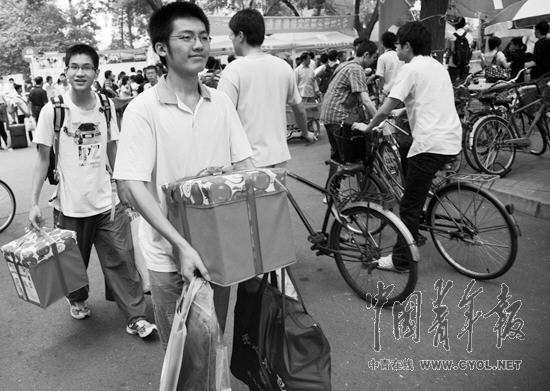 上午9点,两名领取到爱心大礼包的新生高兴地走出“绿色通道”。本报记者 鄢光哲摄