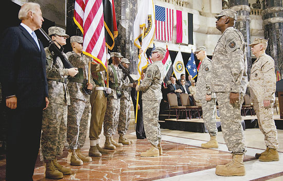 2010年9月1日,伊拉克巴格达,美国副总统拜登、国防部长盖茨和美军参谋长联席会议主席马伦出席美军-伊拉克指挥权交接仪式。该仪式标志着美军在伊拉克的作战任务正式结束。CFP供图