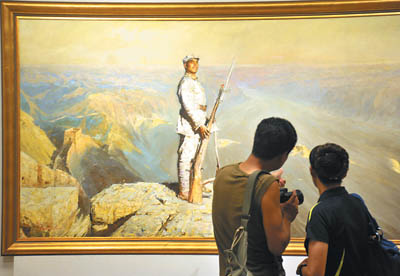 2010年9月4日,两名观众在中国美术馆观看纪念中国人民抗日战争胜利65周年美术作品展览。由文化部主办的“胜利属于人民”——纪念中国人民抗日战争胜利65周年美术作品展览正在中国美术馆举行。今年9月3日是中国人民抗日战争胜利65周年纪念日,也是世界反法西斯战争胜利纪念日。
