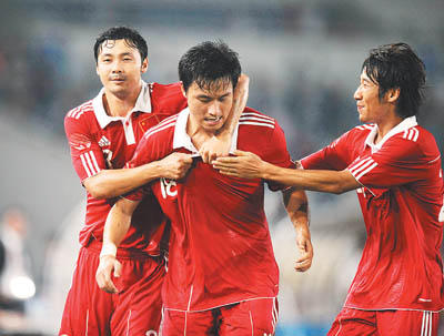 9月7日,中国足球队在南京举行的一场热身赛中,以1∶1战平来访的巴拉圭队。图为中国球员庆贺郜林(中)进球。