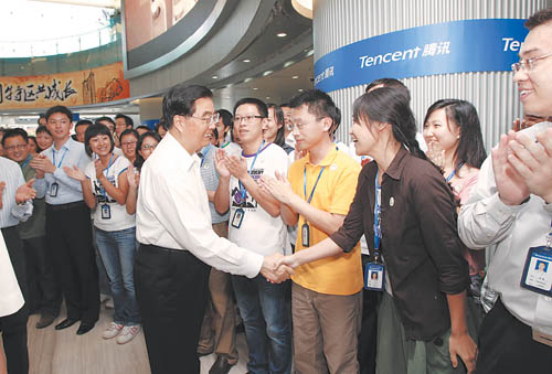 近年来,深圳涌现出一批充满活力的创新型企业,腾讯计算机系统有限公司就是其中的佼佼者。胡锦涛来到腾讯公司,实地了解这家企业在互联网领域进行自主研发的情况。在网络安全监控室、腾讯研究院,总书记饶有兴致地观看QQ最新概念版、眼动仪实验演示。得知这家企业1.2万多名员工平均年龄只有26.8岁、85%%以上拥有本科以上学历,胡锦涛语重心长地对企业年轻员工说,国家的未来在创新,创新的希望在青年。你们公司年轻人多,充满了蓬勃朝气和创新活力,令人感到振奋。希望大家充分发挥聪明才智,坚持自主创新,推动企业不断发展,为壮大民族互联网产业贡献力量。