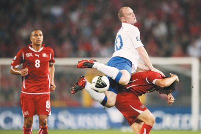 当地时间9月7日,英格兰队在2012年欧锦赛预选赛中,客场以3∶1战胜瑞士队。图为英格兰球员鲁尼(中)与瑞士队球员利希特施泰纳(右)争抢。