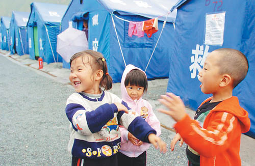9月8日,在舟曲灾后新建的沙川新区,5岁的卢照兴(右)和小朋友正在玩耍。距舟曲泥石流灾害发生整整一个月之际,舟曲路通了、水退了,淤泥在清理、危房在拆除、生活在继续……