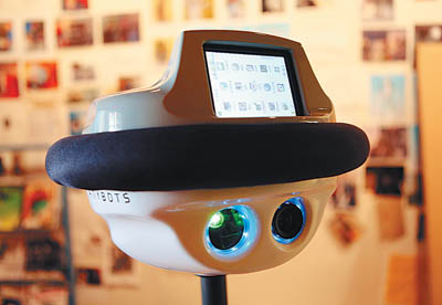 人形机器人是远程会议的好帮手,他的眼睛会把会议情况通过网络传输到电脑上,它很聪明,如果是一个多人会议,他的眼睛会根据指令不停转动,把面画传输出去。图为美国Anybot公司研发的第三代人形机器人QA。