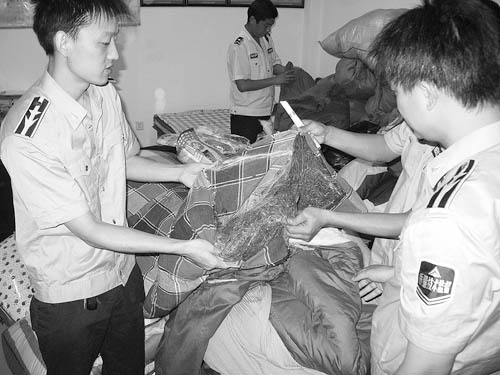 9月9日,工作人员在检验查获的“黑心棉”制品。近日,河北省邯郸市质检等相关部门在河北工程大学校园内及校园周边查获近百套出售给新生的“黑心棉”制品。这些“黑心棉”内部多为用工业下脚料、旧棉絮、医用和生活垃圾等制成的再生棉絮。