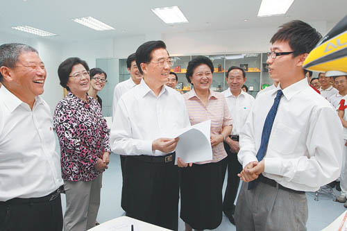 9月9日,胡锦涛总书记来到人大附中和中国人民大学,看望慰问师生员工,向广大教师致以节日祝贺。这是胡锦涛在人大附中设计技术教室亲切勉励学生们勤动手、勤动脑,努力掌握更多真才实学。