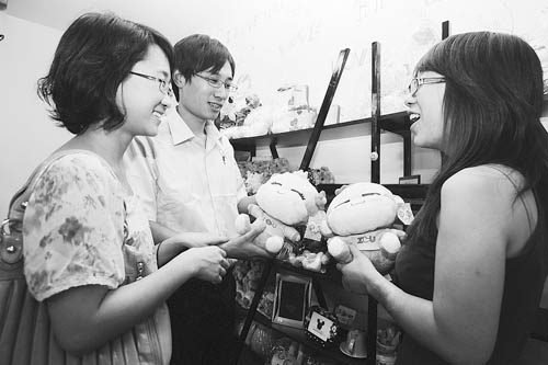 9月11日,“涂卡礼物店”店长、天津大学四年级学生刘凯平(右)向顾客介绍商品。当日,天津市首个集餐饮、淘宝街为一体的大学生创业综合商贸社区“新青年公社”在天津大学开业。