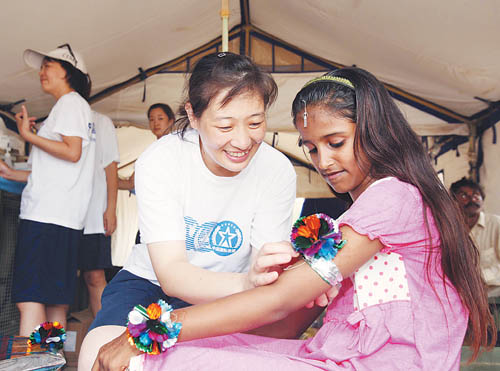 中国救援队的医生在给当地小姑娘佩戴饰品