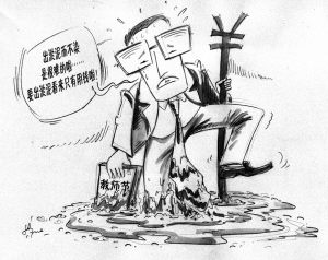 教师节,学生向老师送礼已成为惯例,今年郑州市某中学由学校出钱,让学生给老师表达心意,学校共发了约1.8万元的“感恩经费”。校长称这样做是为了减轻学生负担。(《河南商报》9月13日)漫画:徐简