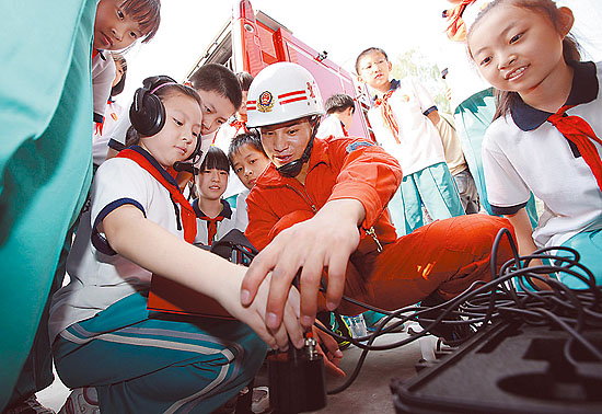 9月14日,前门小学的学生在龙潭湖消防中队的消防队员指导下学习使用生命探测仪。