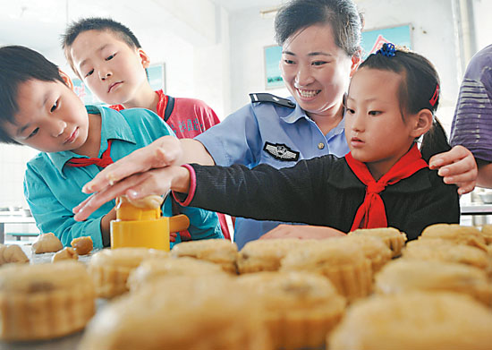 9月15日,民警侯海雁在教几名聋哑儿童制作月饼。