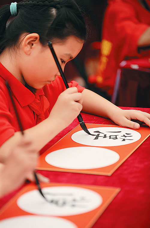 当日,首届“两岸汉字艺术节”在北京太庙拉开序幕。这是两岸首次共同举办以汉字艺术的传承与保护为主题的文化交流活动。在开幕式上,两岸书法家及中国艺术研究院中国书法院的学生近200人,以各种书法字体集体书写“汉字”二字。 新华社记者 赵博摄