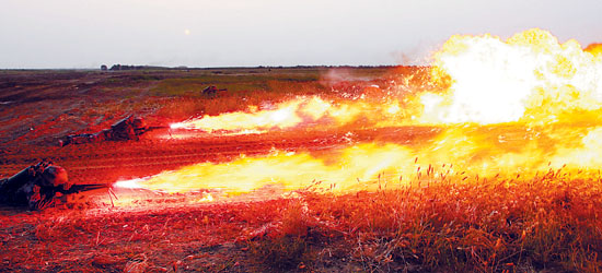 9月16日,济南军区某集团军组织野外驻训部队进行综合演练,装甲、步兵、炮兵、通信、防化和陆航等十多个兵种在生疏地域进行实打、实救、实修。通过演练,一批训练课目得到了实战化检验。图为对“敌”实施喷火攻击(9月16日摄)。毕华明摄(新华社发)