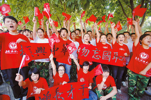 9月18日,在西南政法大学渝北校区内,200名师生高喊“勿忘国耻、铭记历史、振兴中华”等口号,唱起中华人民共和国国歌、大刀进行曲等革命歌曲,以此纪念“九一八”事变79周年。新华社记者 陈诚摄