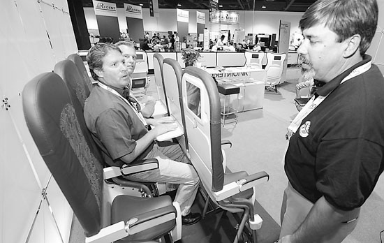 9月16日,在美国加利福尼亚州长滩举办的飞机内饰展上,工作人员试坐意大利飞机座椅设计公司推出的“马鞍”型座椅。