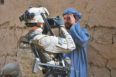 9月5日,美军A连士兵用便携式物证采集器采集阿富汗老百姓的指纹与虹膜特征。