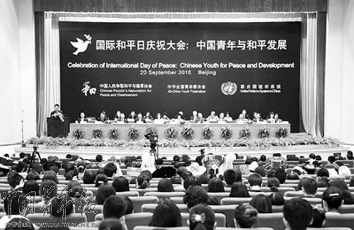9月20日下午,主题为“中国青年与和平发展”的国际和平日庆祝大会在北京人民大会堂举行。