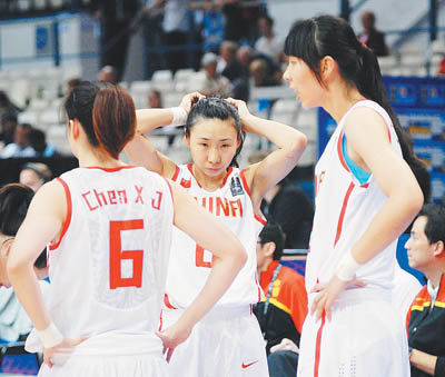 9月25日,在捷克俄斯特拉法举行的2010年女篮世锦赛中,中国队以68∶91不敌澳大利亚队。图为女篮老将苗立杰(中)和陈楠(右)在比赛间隙。
