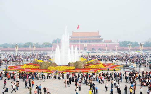 9月25日,北京天安门广场大型“牡丹”花坛摆放完毕,吸引众多中外游客。根据2010年天安门广场国庆花卉布置方案,花坛整体设计以“花开盛世”为主题,采用形式创新、规模缩减的花卉布置方案。其中,广场中心花坛直径50米,通过立体花卉装饰演绎出“花”的形象,寓意祖国繁荣富强,国泰民安。