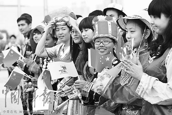 10月1日,“青春世博,祝福祖国”——上海青少年庆祝新中国成立61周年升旗仪式在上海世博园区浦西片区船台广场举行。来自56个民族的青少年身着节日盛装,挥舞着国旗和上海世博会会旗,高呼“祖国万岁”。 本报记者 陈剑摄