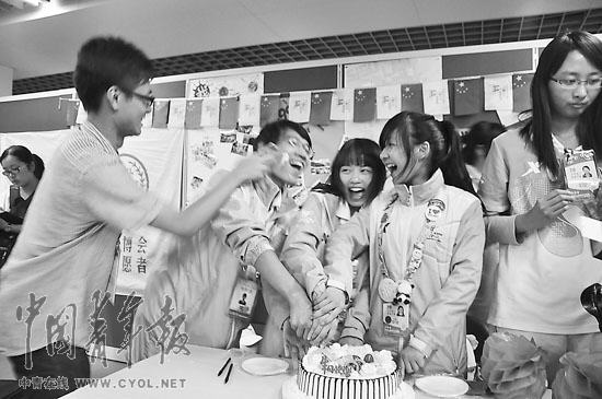 10月1日,上海世博园志愿者休息室里,上海外国语大学的志愿者王志明、蒋怡、丁星月(左二起)在园区度过了一个难忘的生日。本报记者 周凯摄