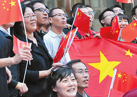 当日,芝加哥华人华侨及中国留学生数百人聚集在芝加哥市中心戴利广场,参加在此举行的国庆升旗仪式,庆祝中华人民共和国成立61周年。蒋新彤摄(新华社发)