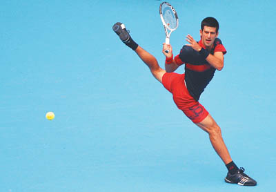 10月9日,在北京举行的2010中网男单半决赛中,塞尔维亚选手德约科维奇以2∶0击败美国选手伊斯纳尔。图为德约科维奇在比赛中回球。