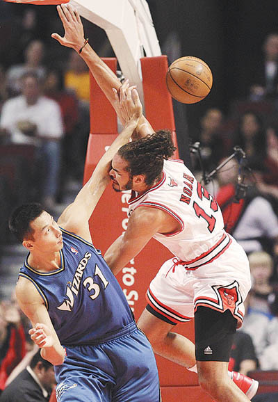 10月9日,在芝加哥举行的NBA季前赛中,华盛顿奇才队以96∶107负于芝加哥公牛队。图为易建联(左)与对手争抢。
