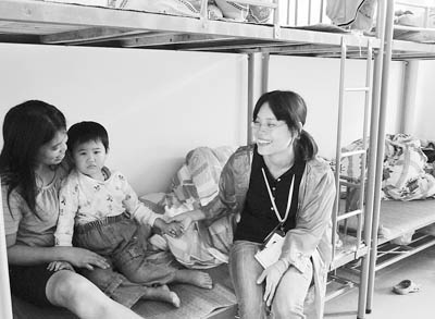 10月9日,志愿者在文昌市育才小学的安置点与受灾群众交流。