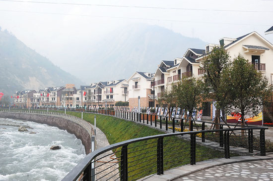 这是10月10日拍摄的重建后的映秀镇一角。当日,广东省对口支援四川省汶川县恢复重建任务全面完成庆祝大会在汶川映秀镇举行。汶川特大地震过后,广东承担起对口支援汶川恢复重建任务。经过两年多艰苦奋战,由广东省投资82亿元援建的702个项目全面竣工。新华社记者 吴鲁摄