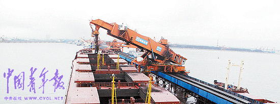 运输到秦皇岛港的煤炭,通过传送带,直接装船运达目的地。