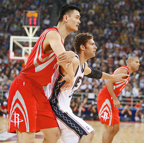 10月13日,2010NBA中国赛北京站,休斯敦火箭队以91∶81战胜新泽西篮网队。图为姚明(左)在比赛中。CFP供图