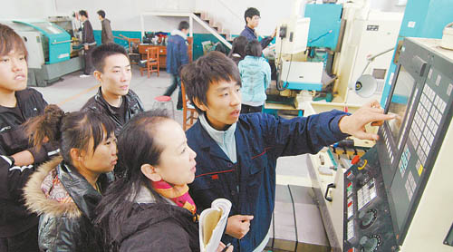 10月20日,辽宁石油技术学院的大学生在给农民工介绍高科技数控设备。