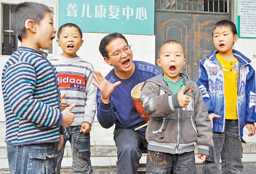 10月21日,邱新会(左三)在河南漯河聋儿康复中心配合鼓点教学生发音。