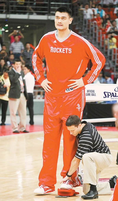 10月16日,在中国广州举行的NBA中国赛广州站比赛前,球队工作人员给姚明系鞋带。