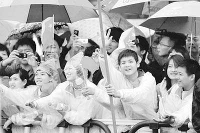 10月23日,当地学生冒雨为亚运火炬传递加油助威。当日,冒着台风“鲇鱼”带来的风雨,第16届亚洲运动会火炬传递活动在“岭南水城”——广东省揭阳市举行。当天共有80名火炬手在7.3公里的线路上进行传递。