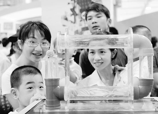 10月24日,在广西玉林举行的青少年科技创新成果展展厅,几名青少年体验气流回旋器的奥秘。