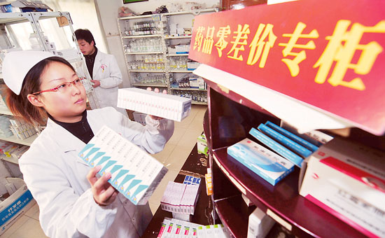 安徽省肥西县严店乡卫生院药房的一位医务人员在整理货架上的药品。从2010年1月1日起,安徽省32个试点县(市、区)基层医疗卫生机构将全面实行基本药物和补充药品零差率销售。CFP供图(资料图片)
