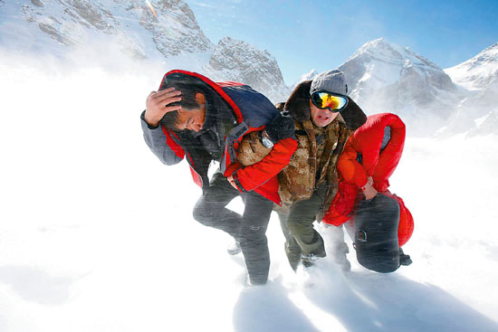 10月27日,新疆维吾尔自治区应急办主任伊力(中)将被困的工程师带上直升机。