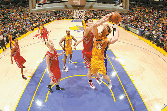 10月27日,在NBA常规赛首轮比赛中,火箭队客场以110∶112惜败于湖人队。图为姚明封盖加索尔投篮。CFP供图