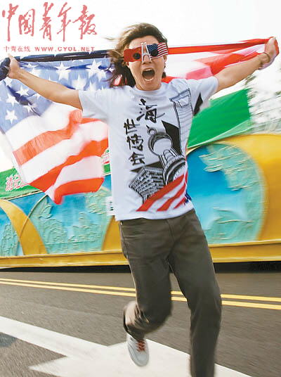 10月31日,美国馆的工作人员在世博大道狂欢。