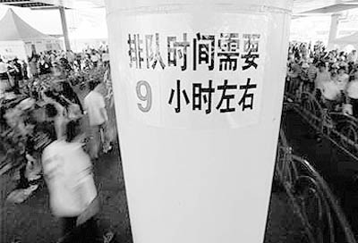 我不知道前来世博园的中国人都是什么样的素质,但我明确告诉你,如果我是外地的,如果是我自己买票到世博园旅游,那么,当我进入世博园后,当我没有选择,当我绝望地看着长长的队伍的时候……我一定会找机会买通人带我进去,甚至会生出租一个轮椅的念头……