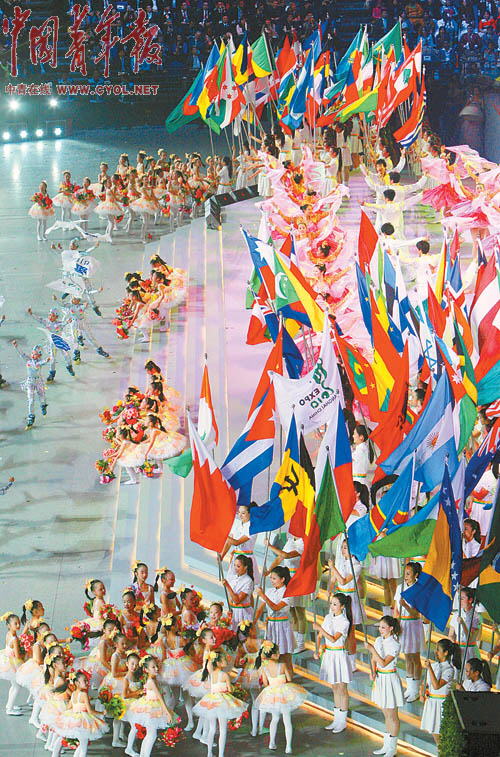 顿时,全场响起阵阵热烈的欢呼声和掌声。手举国际展览局旗、上海世博会旗的轮滑少年从会场两侧涌上场地中央。伴着音乐的节拍,上百名少年儿童手持鲜花和花环,200多位少女手举参展国家和国际组织的旗帜,尽情挥舞,把闭幕式现场气氛推向高潮。