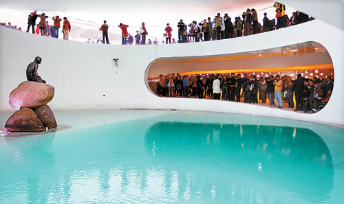 10月31日,游客在丹麦馆看小美人鱼“最后一眼”。当日,2010年上海世博会闭幕,小美人鱼也将返回她的家乡。