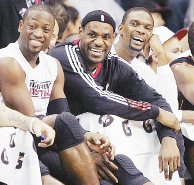 11月1日,热火队“三巨头”韦德(左)、詹姆斯(中)和波什在替补席上喜笑颜开。