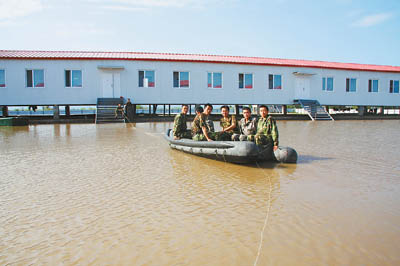 事实证明了设计者的确有远见。2009年夏天,黑瞎子岛全岛被洪水淹没,营区水深达1.5米,两栋板房之间距离不到30米,吃饭来回要靠橡皮艇摆渡,战士们编顺口溜说:“岛上的路水来铺,进门出门靠摆渡。”