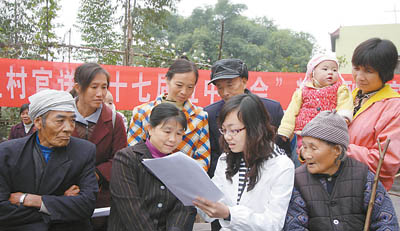 中共十七届五中全会闭幕后,郑艳蓓等5名重庆市永川区卫星湖街道办事处的大学生村官,组成十七届五中全会精神宣讲队,他们收集整理党的十七届五中全会相关资料,走进农家院坝、走上田间地头,为广大村民讲解中央新政策。